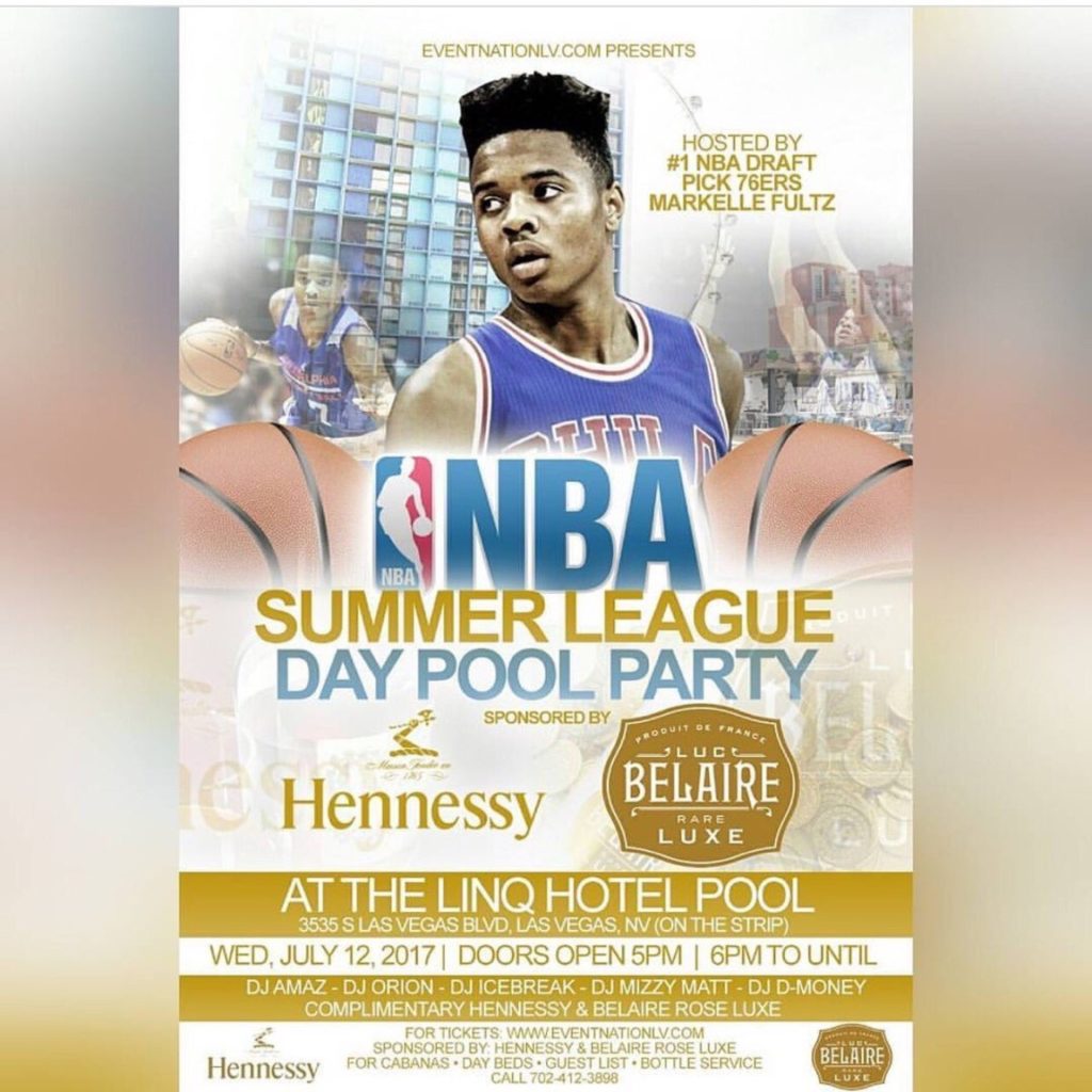 The NBA Summer League Day Pool Party is hosted by Markelle and happens to be sponsored by two alcohol companies. The kid is 19, right? His parties are sponsored by Hennessy and Belaire Luxe.